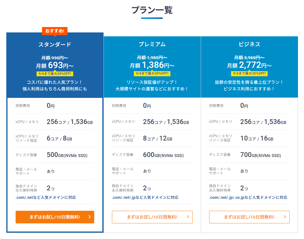 カゴヤでは、「スタンダードプラン」が個人ブログや小規模サイトにおすすめです。月額1,000円程度で、ディスク容量が50GB、転送量が無制限で提供されます。手軽に始められる料金体系で、サイト規模が小さければ十分な性能を発揮します。特にコスト重視の個人運営者にとっては、低価格で高機能なサービスを提供するため、非常に使い勝手が良いプランです。