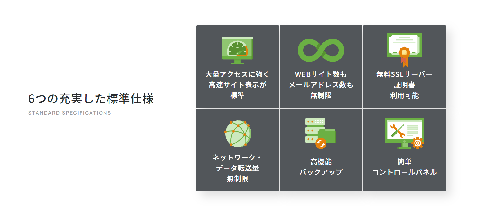 サーバー速度 | 高速化技術「KUSANAGI」に対応 | SSD搭載で安定した速度 |